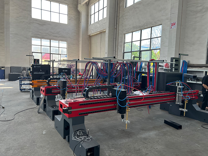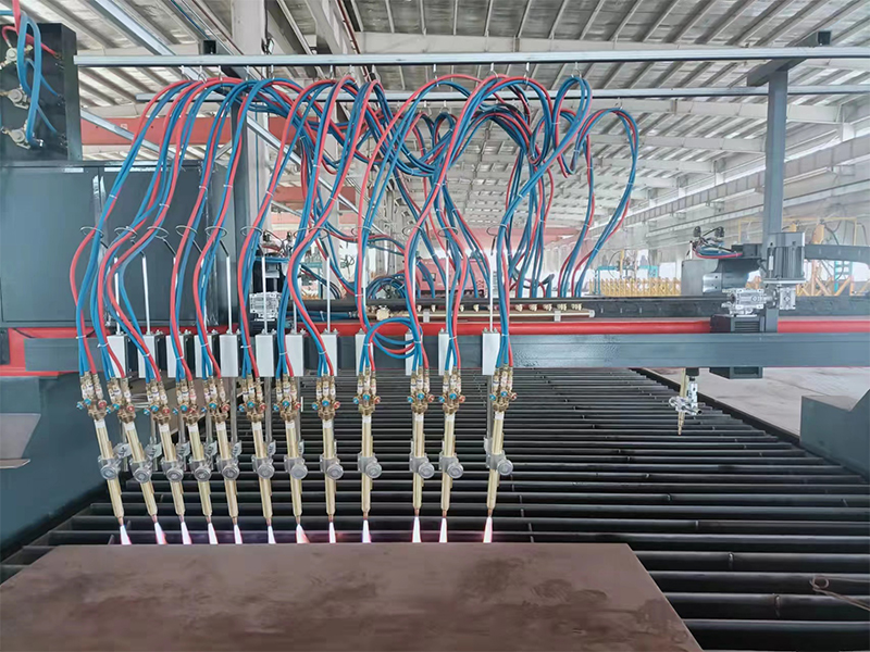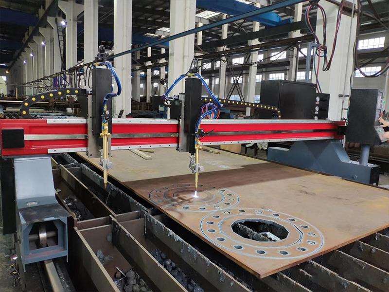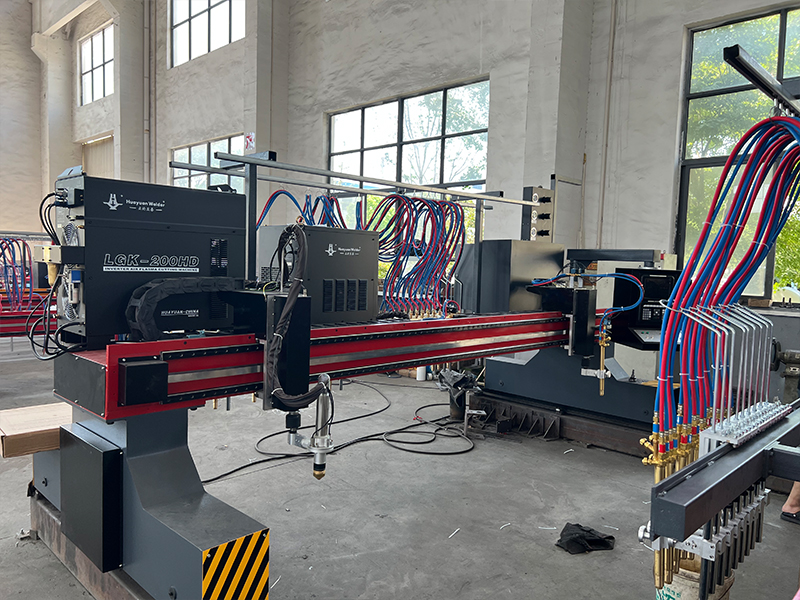 CNC数控切割机系列产品采用龙门式结构,结构件采用特制的矩形管拼成箱式结构,在保证焊接强度的前提下,为减少焊接变形方管间的焊接采用间断焊。焊接完成后,在对焊件进行整体退火和抛丸处理,使焊接的残余应力得到充分的释放,保证了整个机身长期工作不变形,从而提高了机床的高精度,运行平稳,保证切割质量。